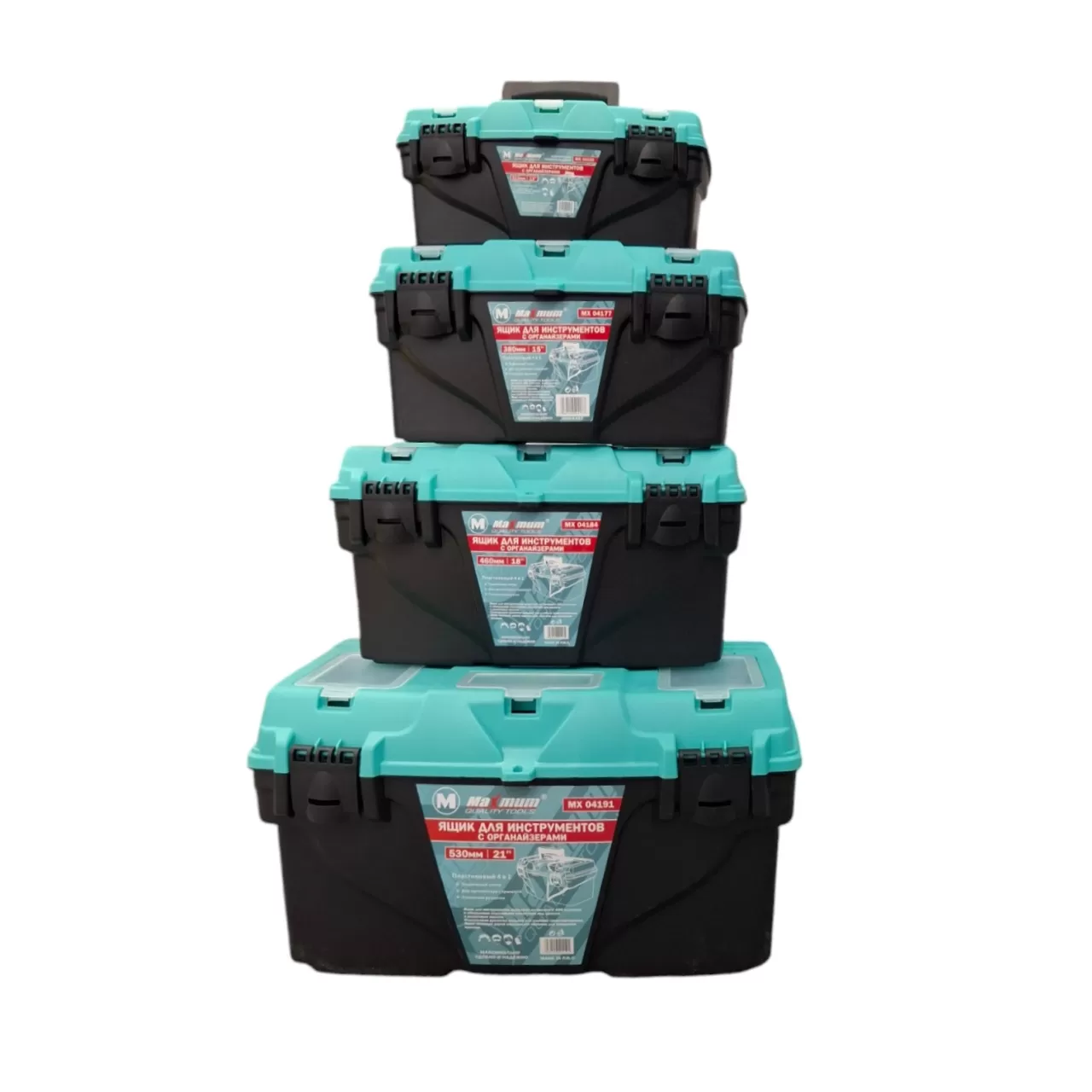 Набор ящиков для хранения инструментов включает в себя 4 комплекта для простого и безопасного хранения молотков, пил, стамесок, ответок и прочих метких деталей для ремонта. Каждый ящик оборудован внутренним подвижным лотком с рукояткой и тремя внешними небольшими прозрачными органайзерами. Инструментальные ящики-органайзеры имеют по два специальных надежных замка и удобную, прочную ручку для переноски. Габариты ящиков (внешние):